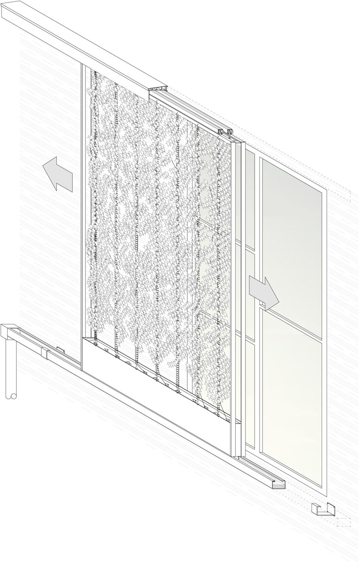 Este sistema de construcción de fachadas vegetales es muy fácil de montar y constituye una protección solar móvil para ventanas o puertas. Sin embargo, la aplicación del panel deslizante solo es posible en aquellos edificios con coberturas al exterior (puertas y/o ventanas) que tengan el espacio suficiente para su colocación.