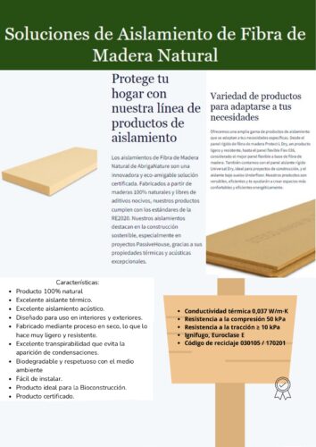 Los aislamientos de Fibra de Madera Natural de AbrigaNature son una innovadora y eco-amigable solución certificada. Fabricados a partir de maderas 100% naturales y libres de aditivos nocivos, estos productos cumplen con los estándares de la RE2020.