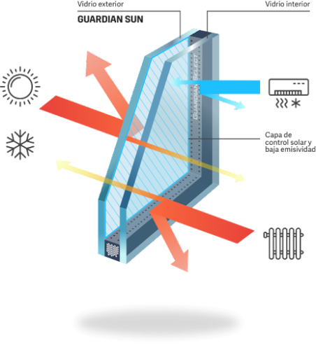 Las Ventanas Guardian Sun de la empresa Guardian Glass, es un vidrio inteligente, que cuenta con alta tecnología. Tiene aplicada una capa manetrónica permanente que le aporta propiedades de aislamiento térmico.