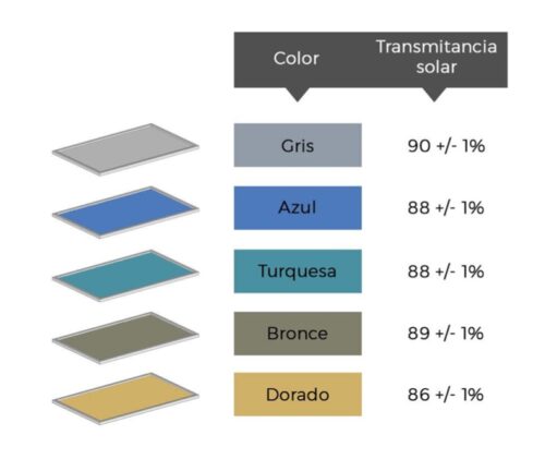 El color gris tiene una transmitancia solar de 90+/- 1%, el color bronce tiene una del 89+/- 1%, los colores azul y turquesa del 88+/- 1% y el dorado del 86+/- 1%, por lo anterior los tonos gris y bronce transportan un porcentaje de energía más elevado que los otros.